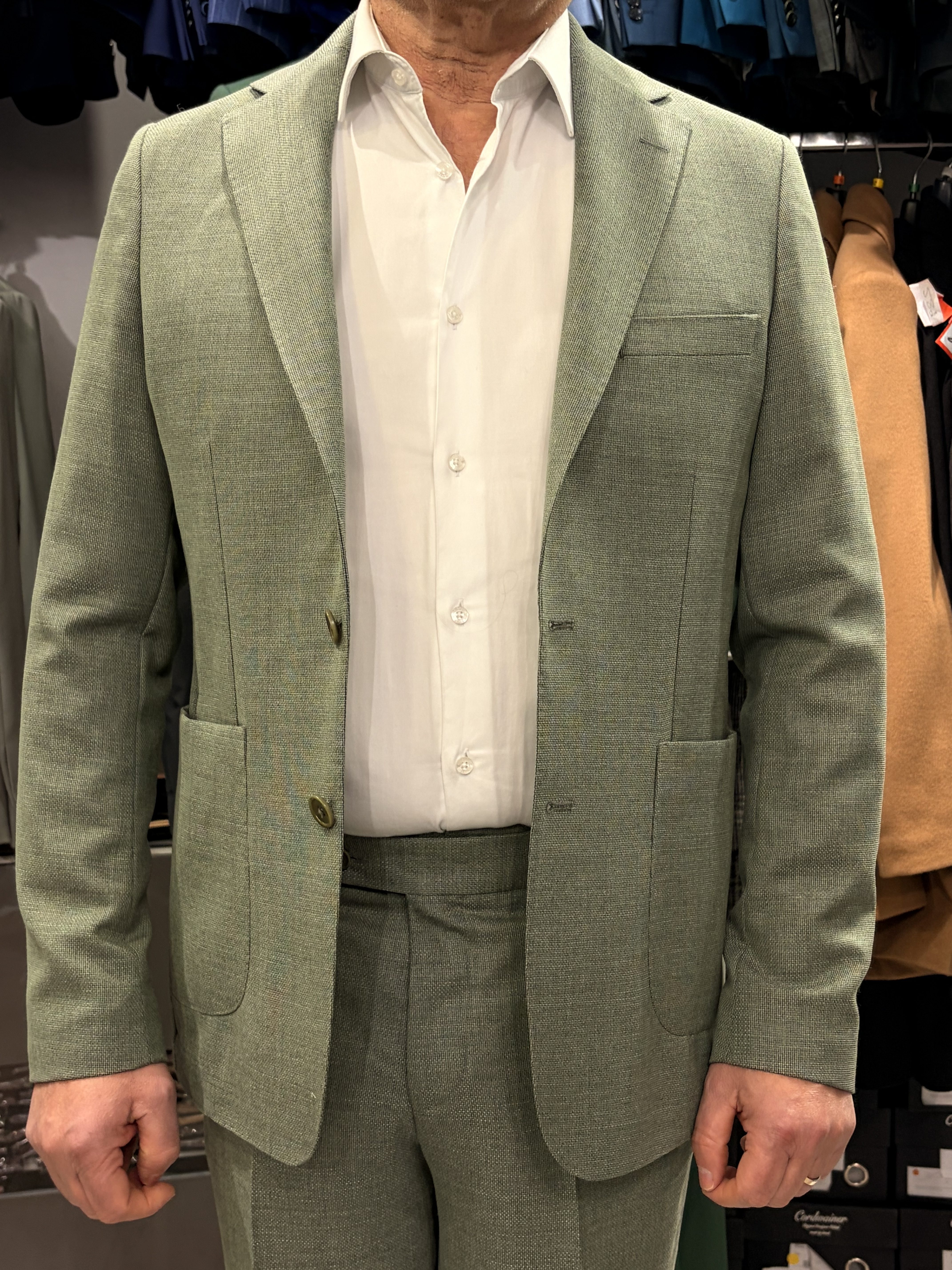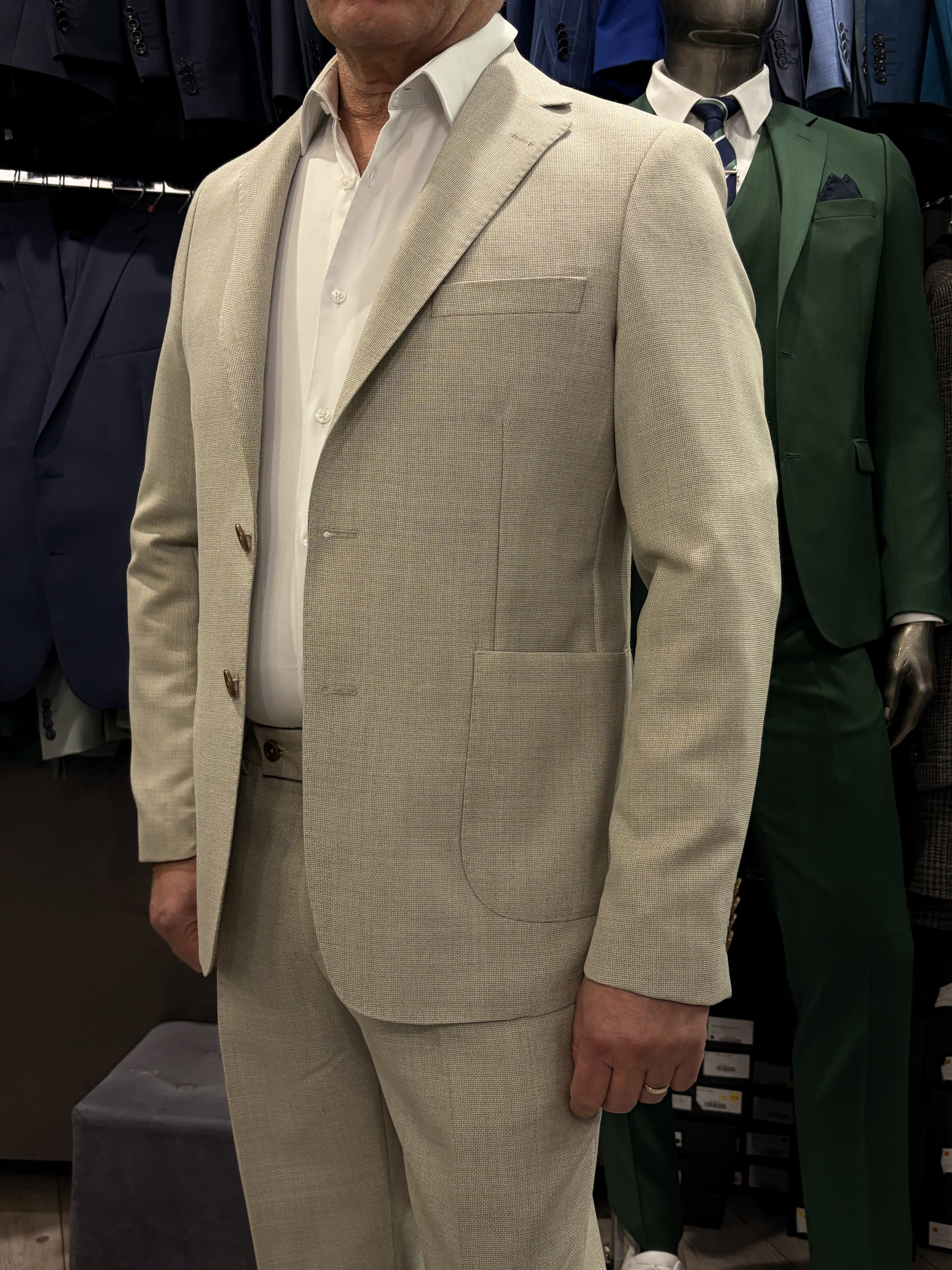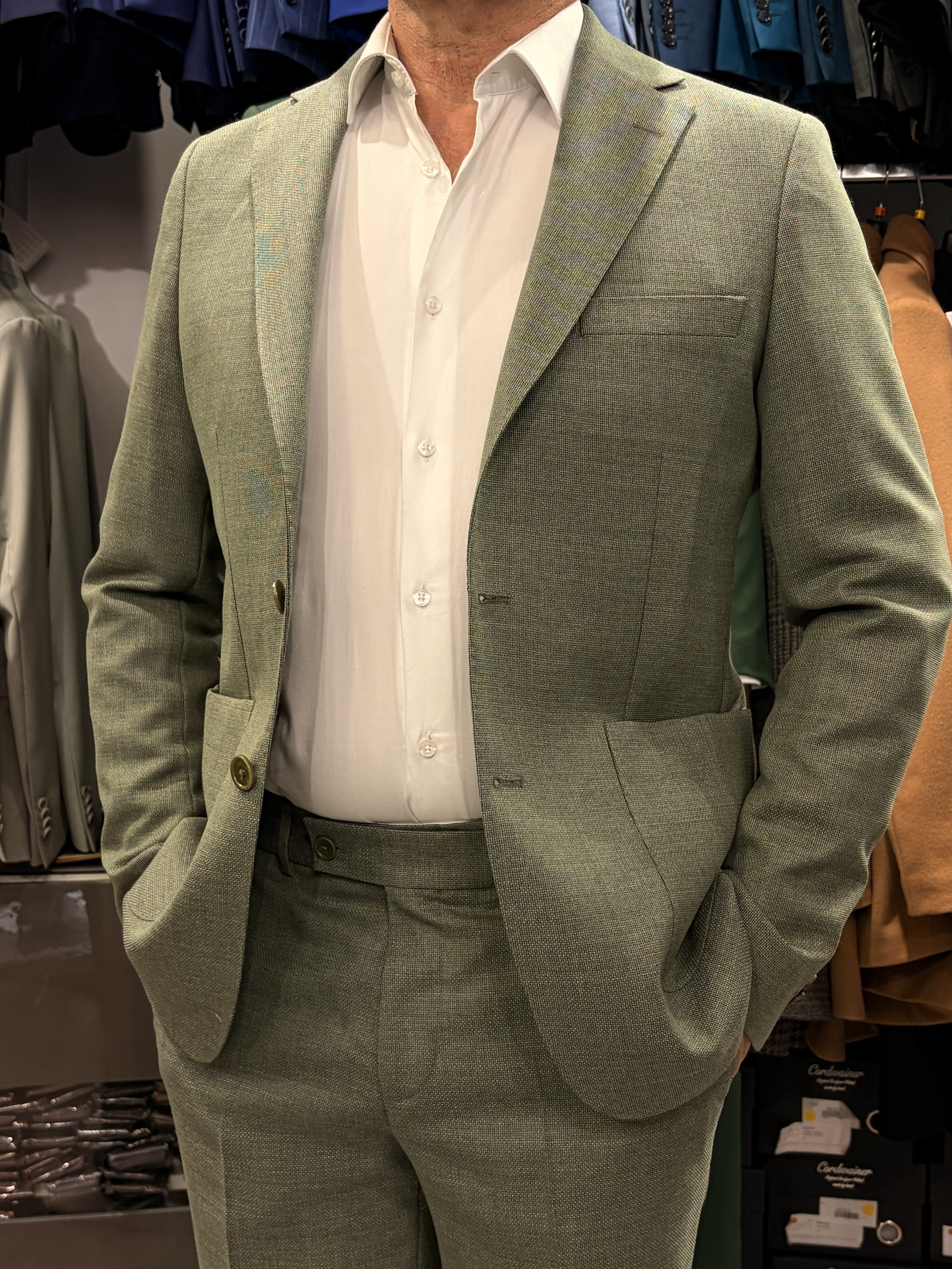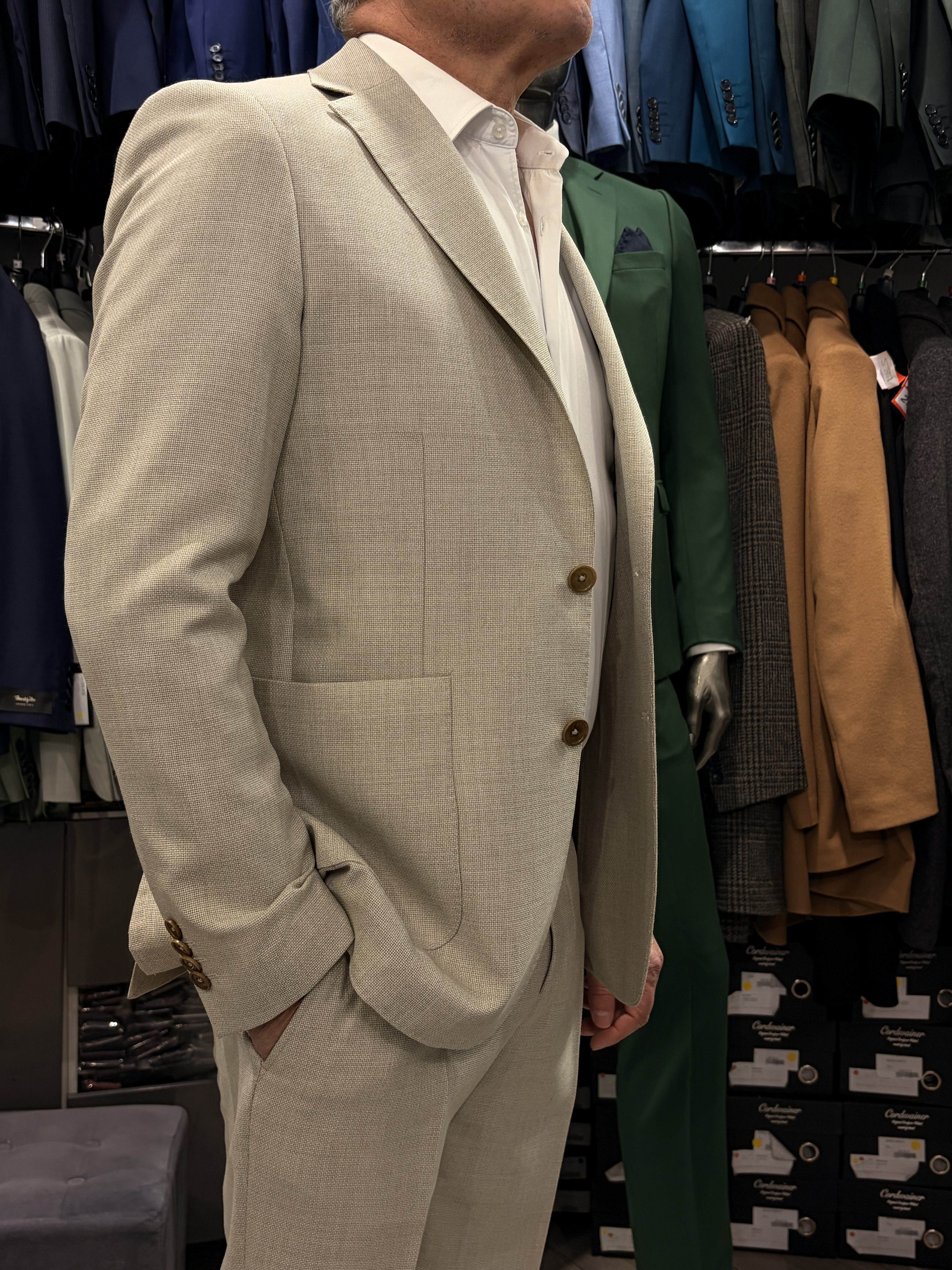 Costume en laine légère sans doublure, conçu pour une respirabilité maximale et un confort naturel.
