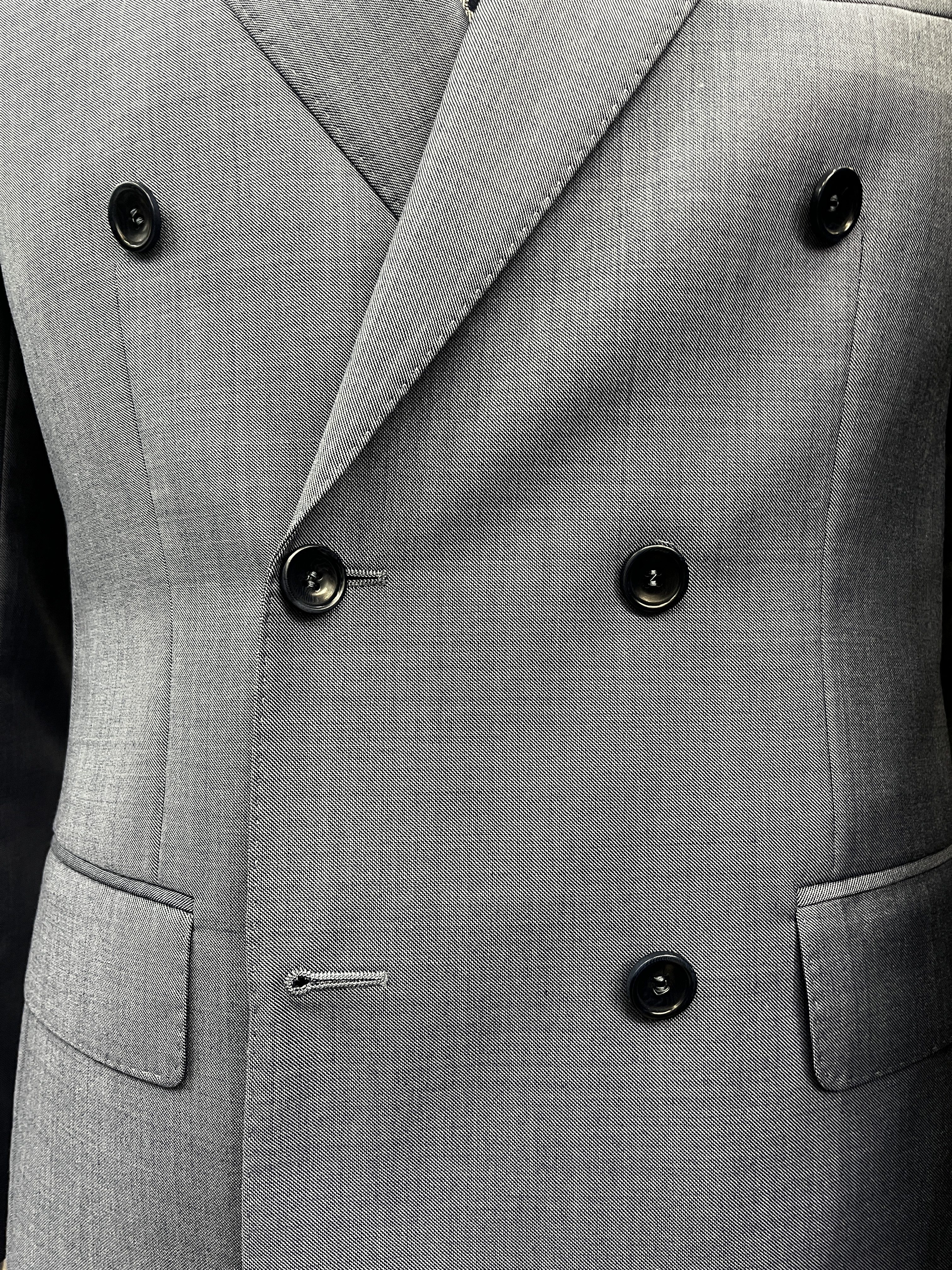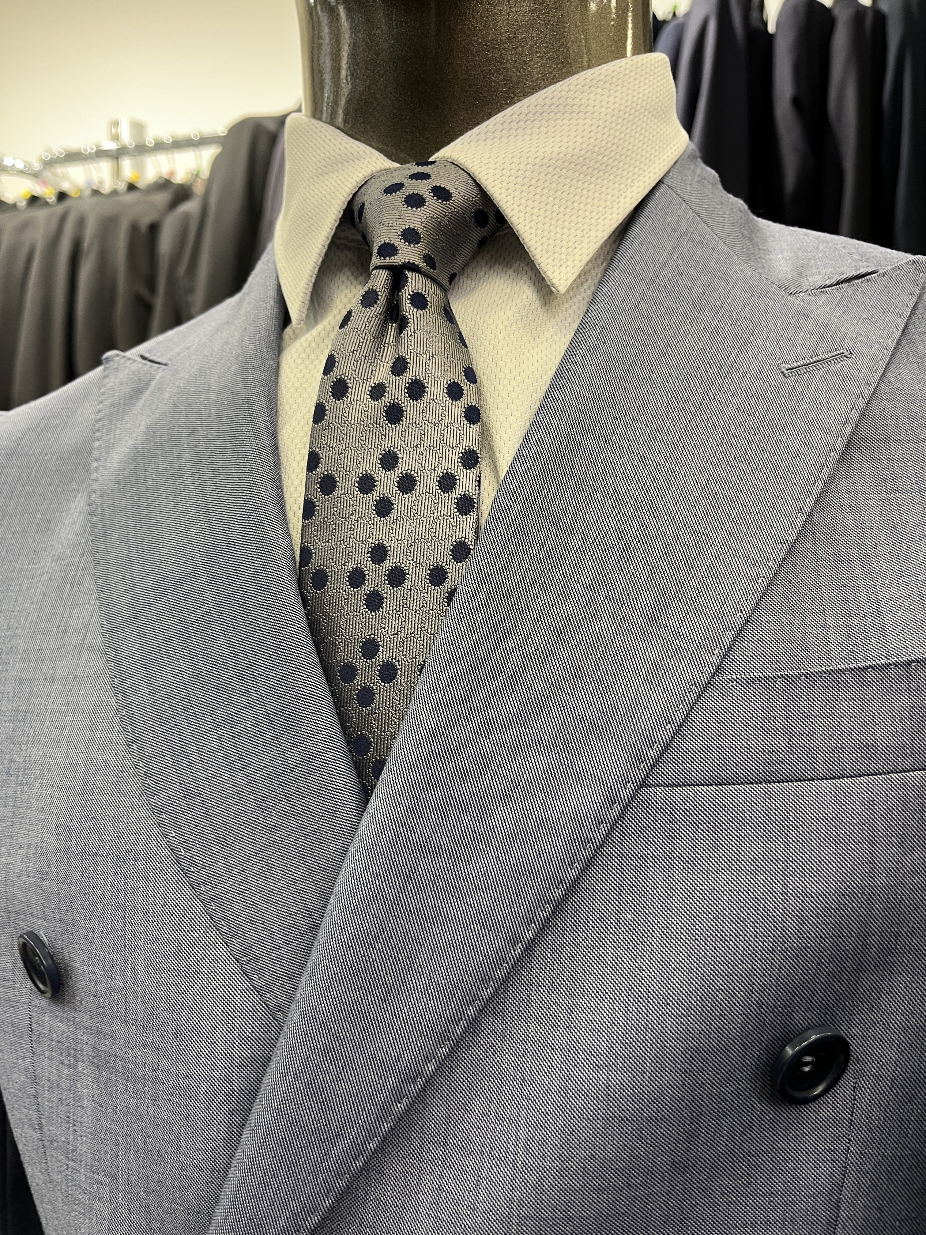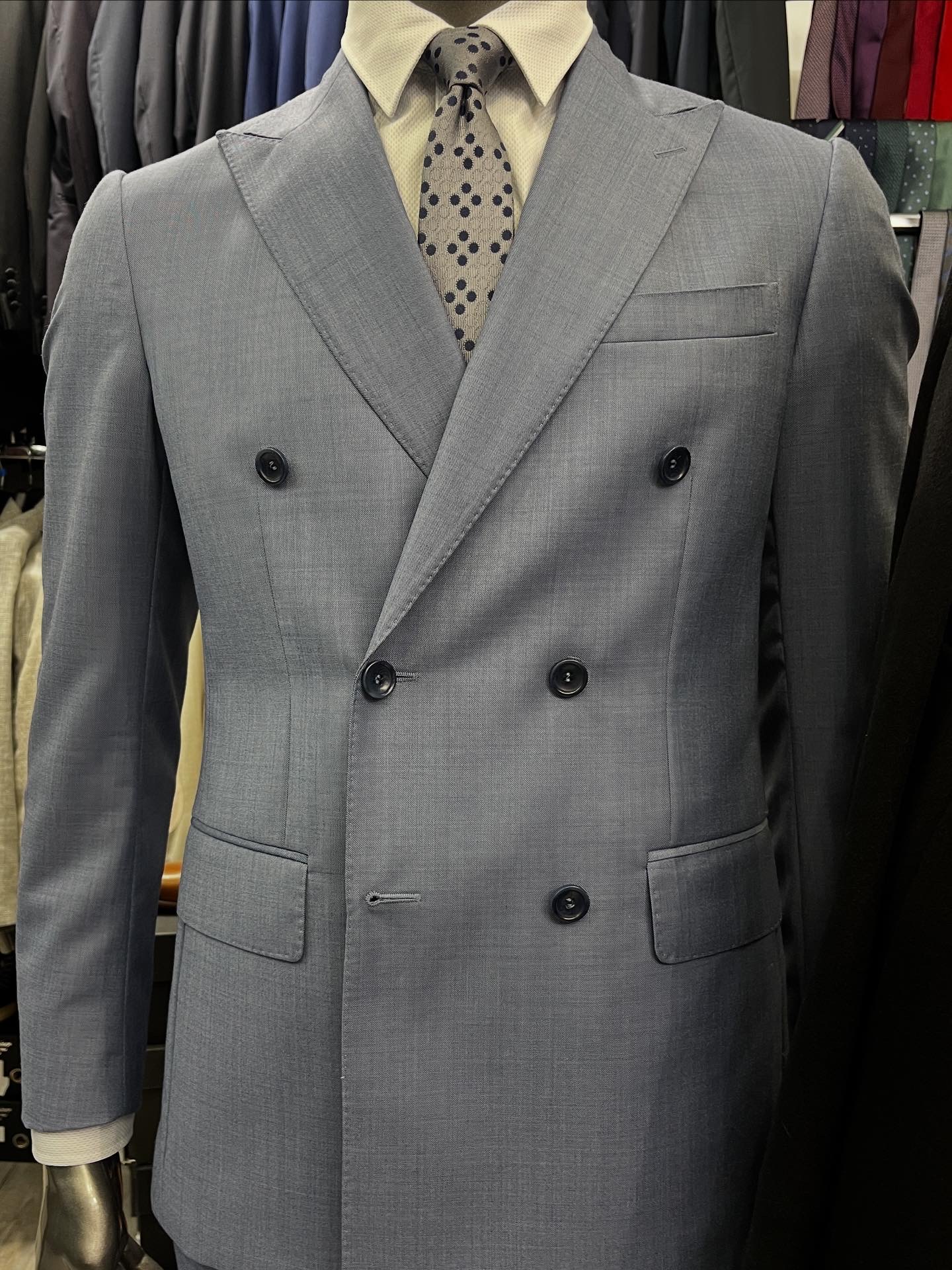 Confectionné dans un tissu de laine haut de gamme, ce costume croisé se distingue par sa couleur bleu ciel, subtil et sophistiqué.