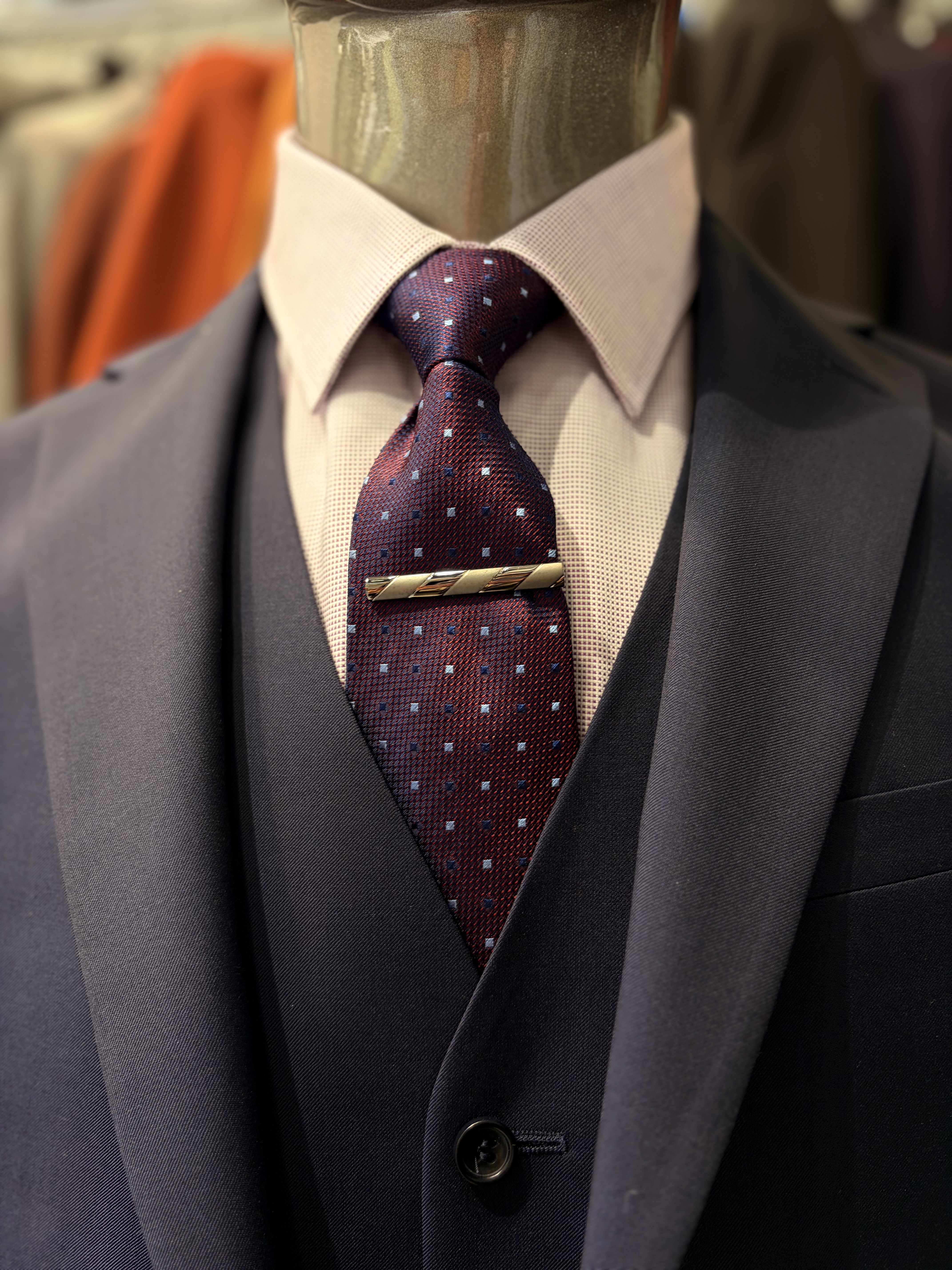 Il est porté ici avec une cravate bordeaux et sa pince à cravate, ainsi qu’une chemise à motifs rose et violet.