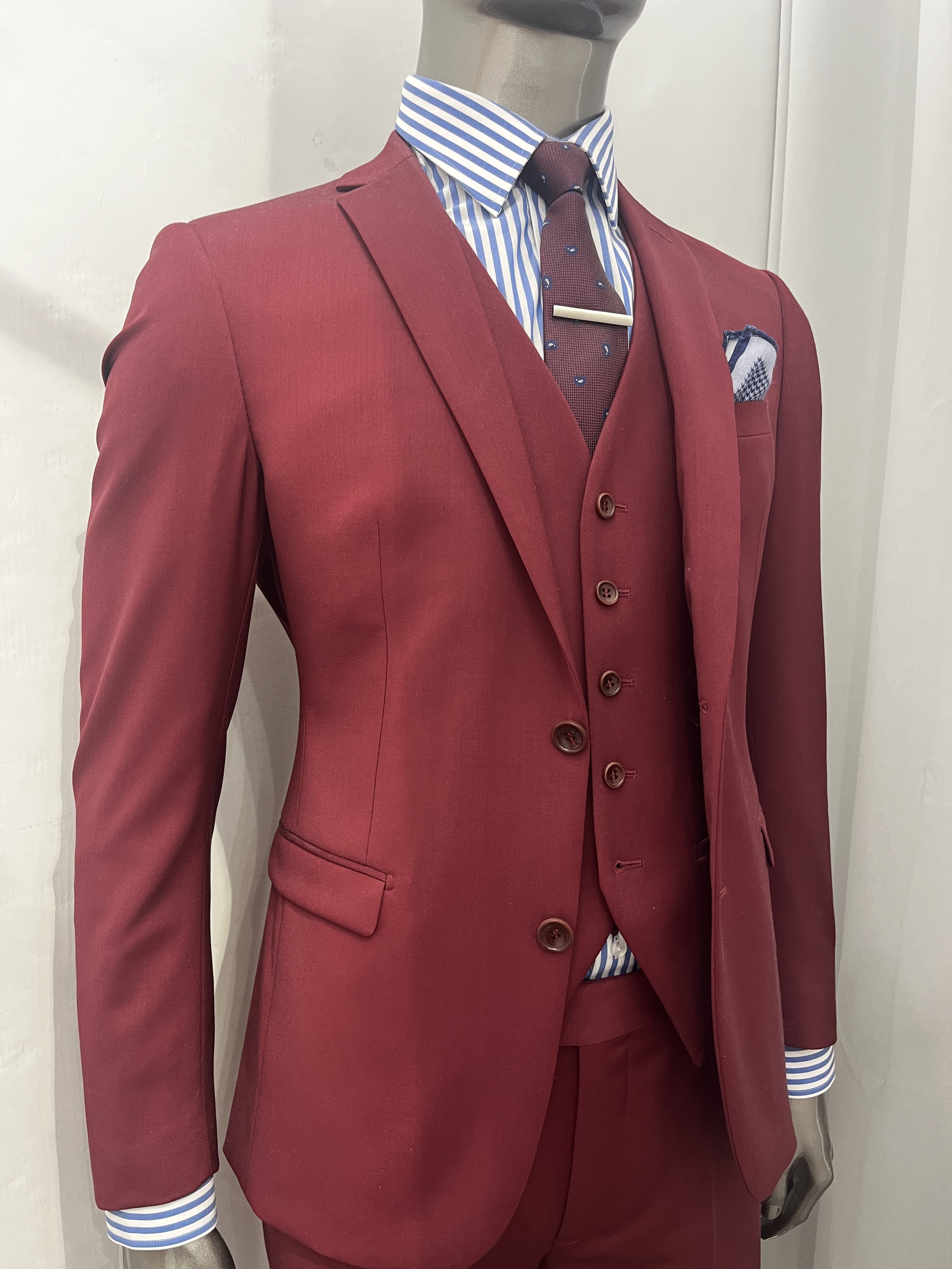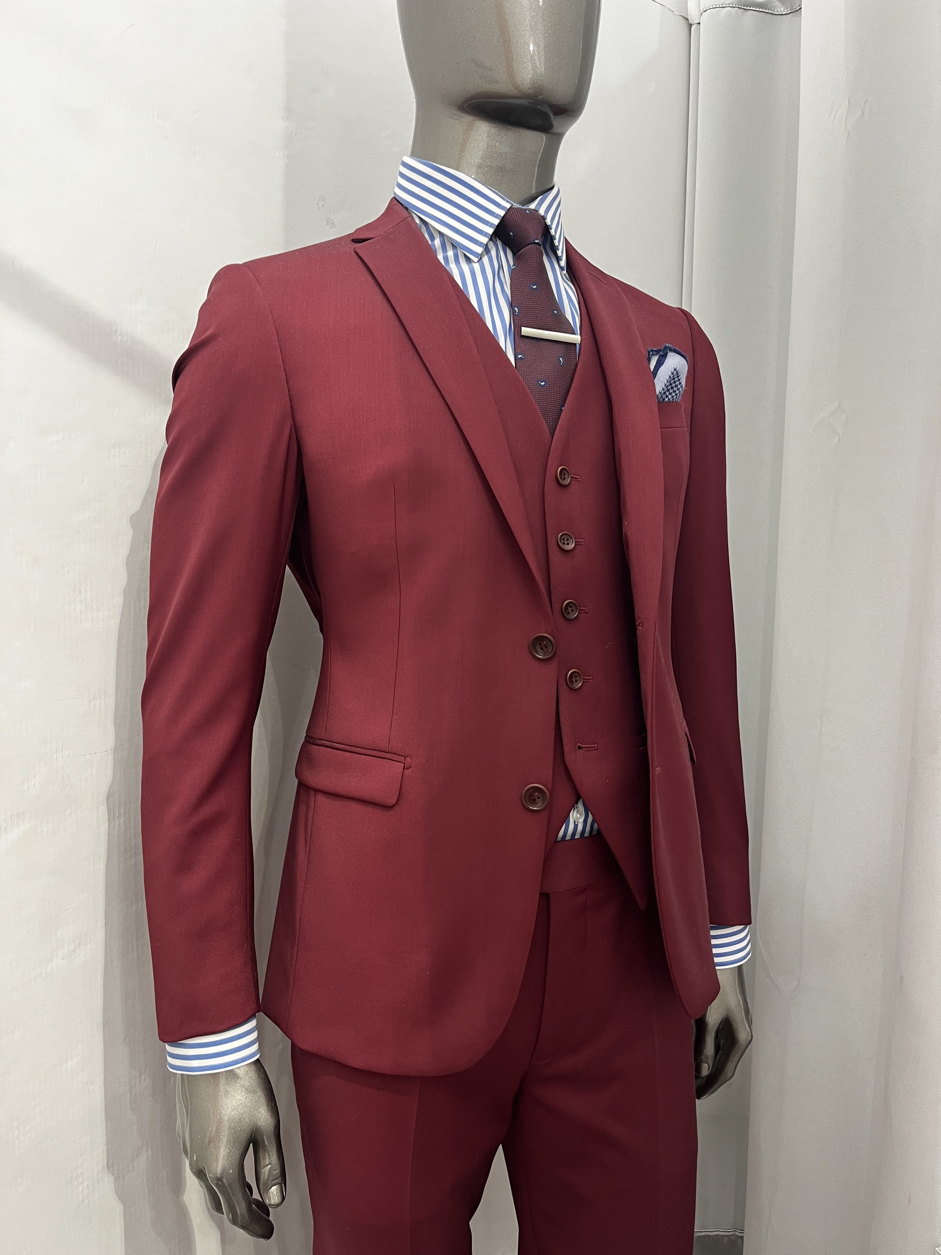 Alliez élégance et personnalité avec ce costume trois pièces bordeaux, pour ceux qui souhaitent se distinguer avec assurance.