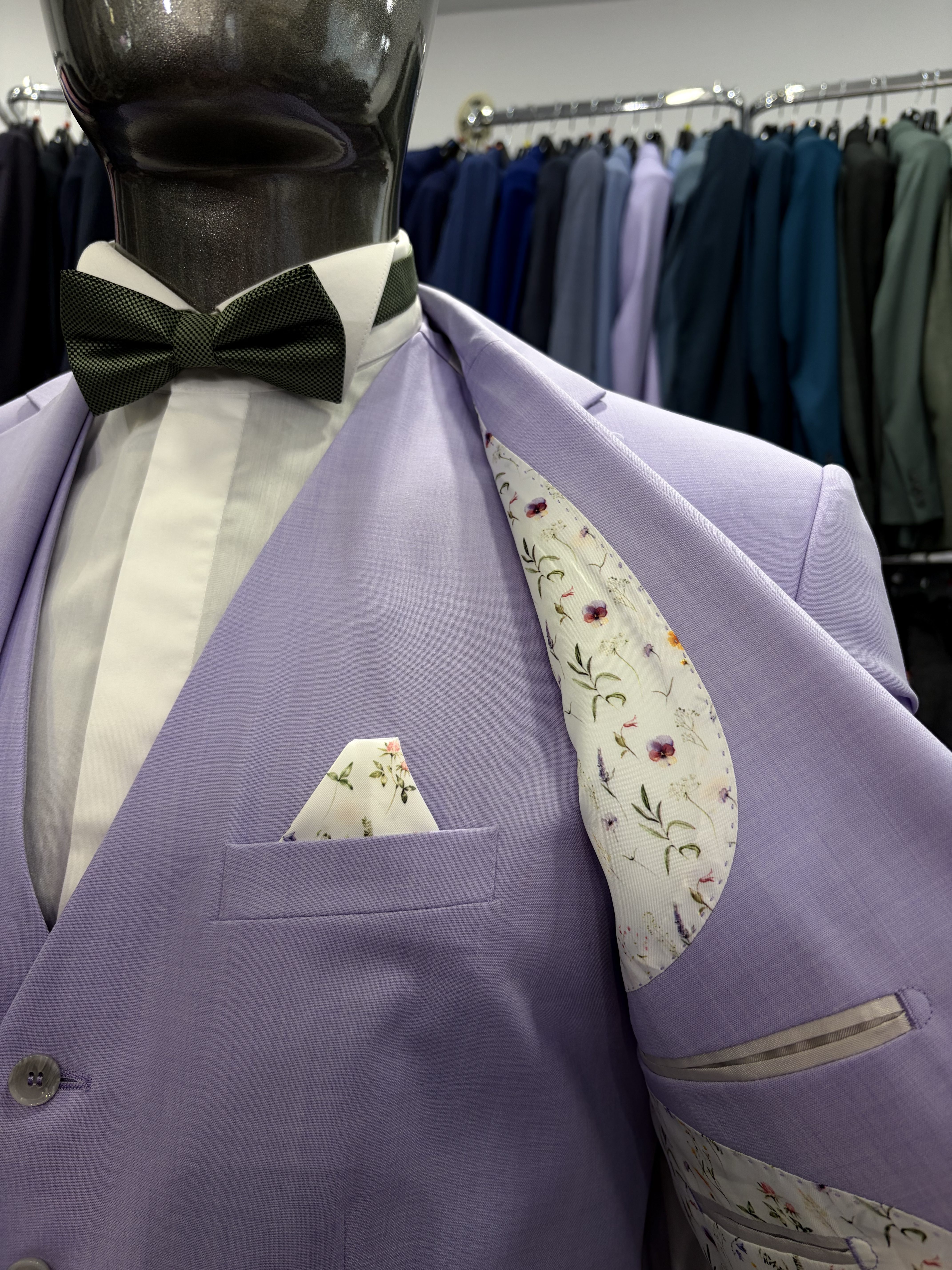 Costume trois pièces parme avec doublure fleurie pour encore plus de chic, parfait pour vos mariages aux thèmes provençal, bohème chic ou méditerranéen.